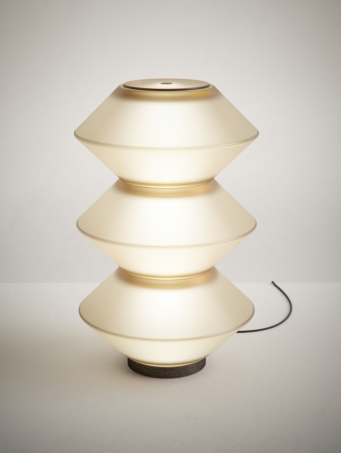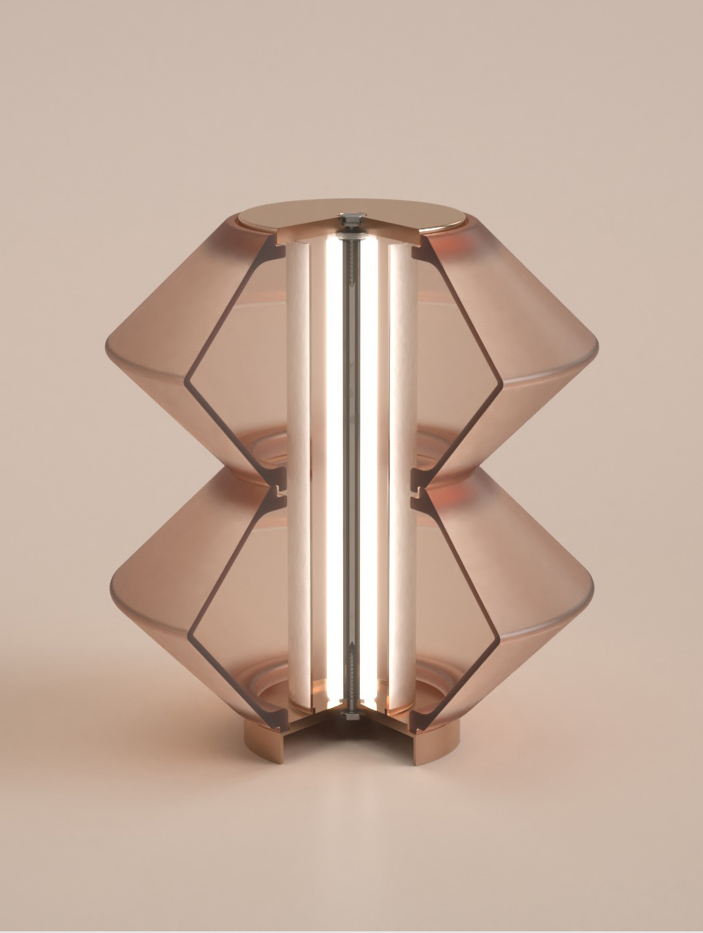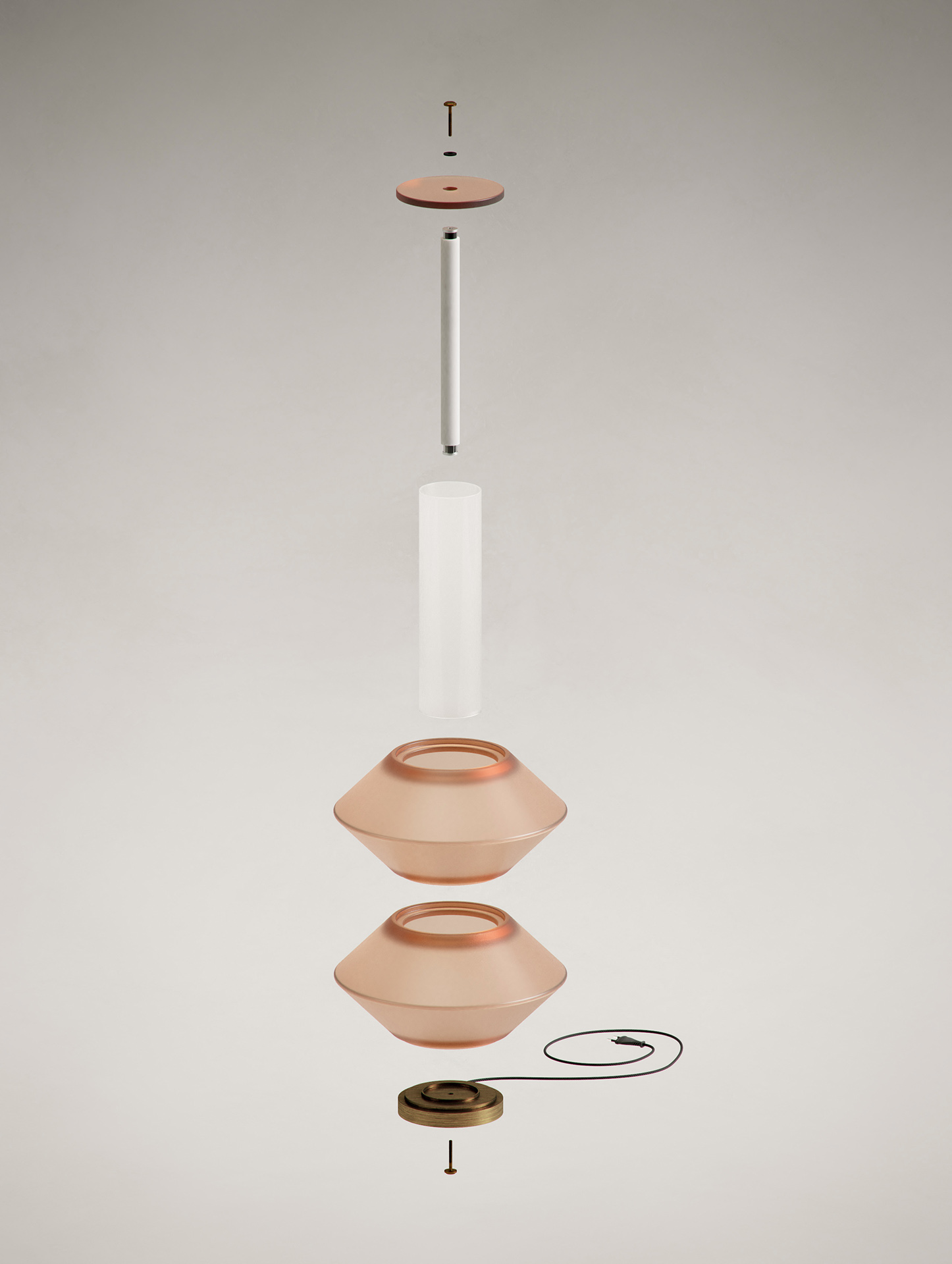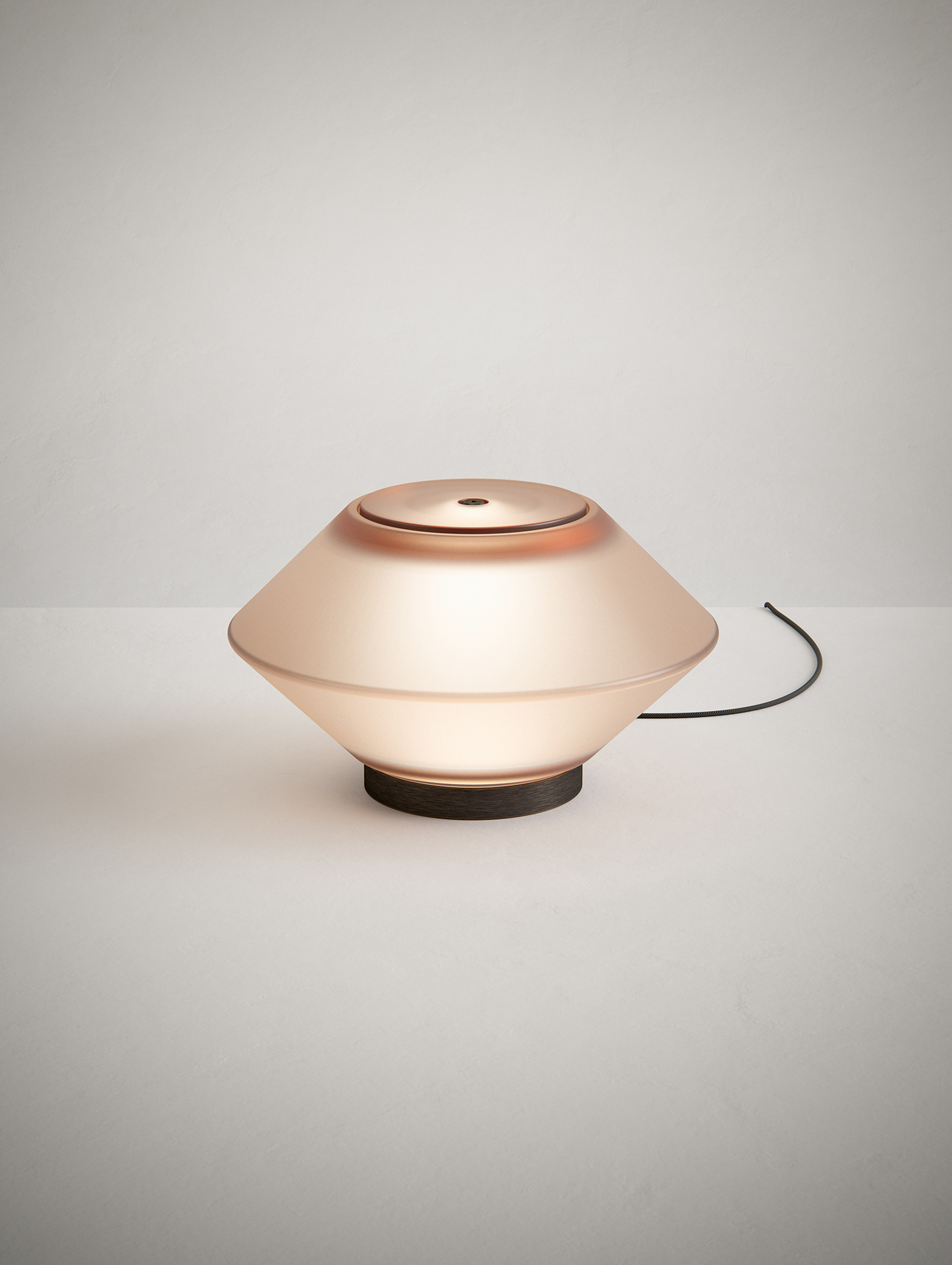 There are 3 models of table lamps and 2 suspension models in 3 pastel colors: peach, champagne and mint.